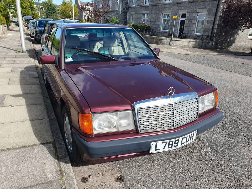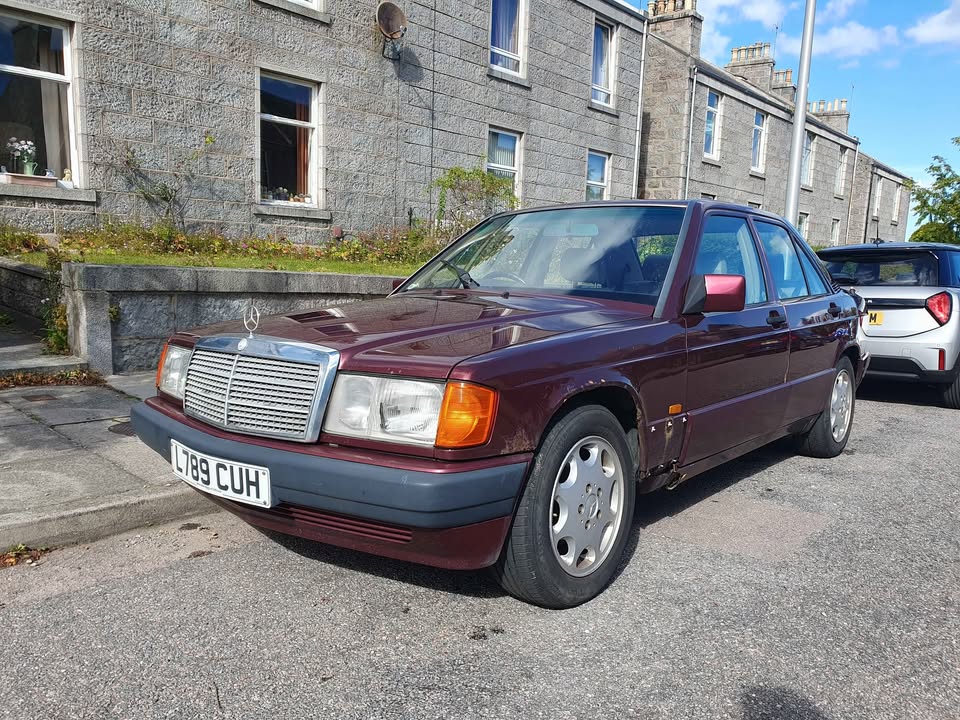 Mercedes 190e for sale. No MOT, but starts drives and runs nicely. Engine is sound, but bodywork is a bit patchy in places, underneath is good but a little corroded from age.