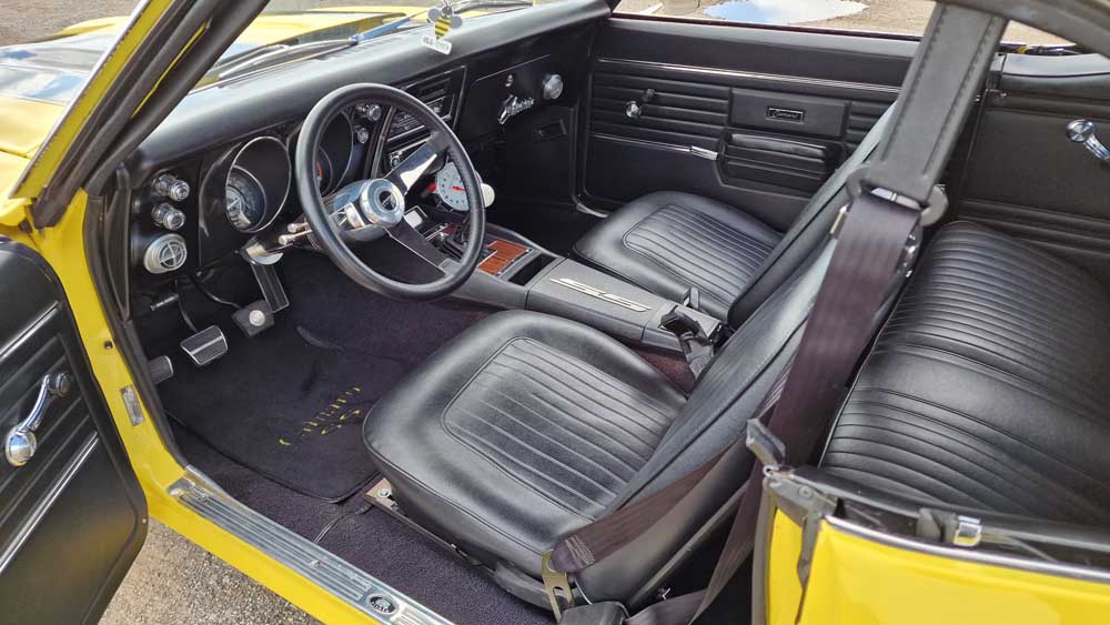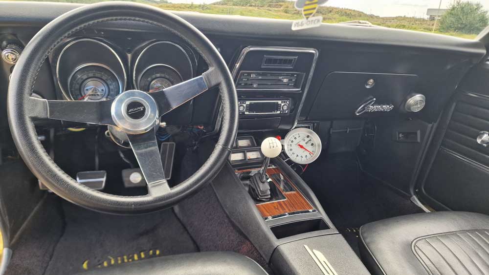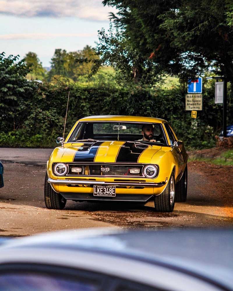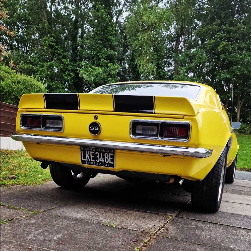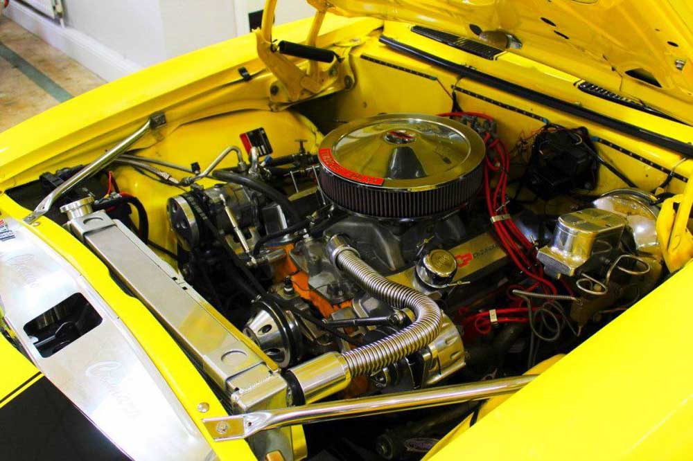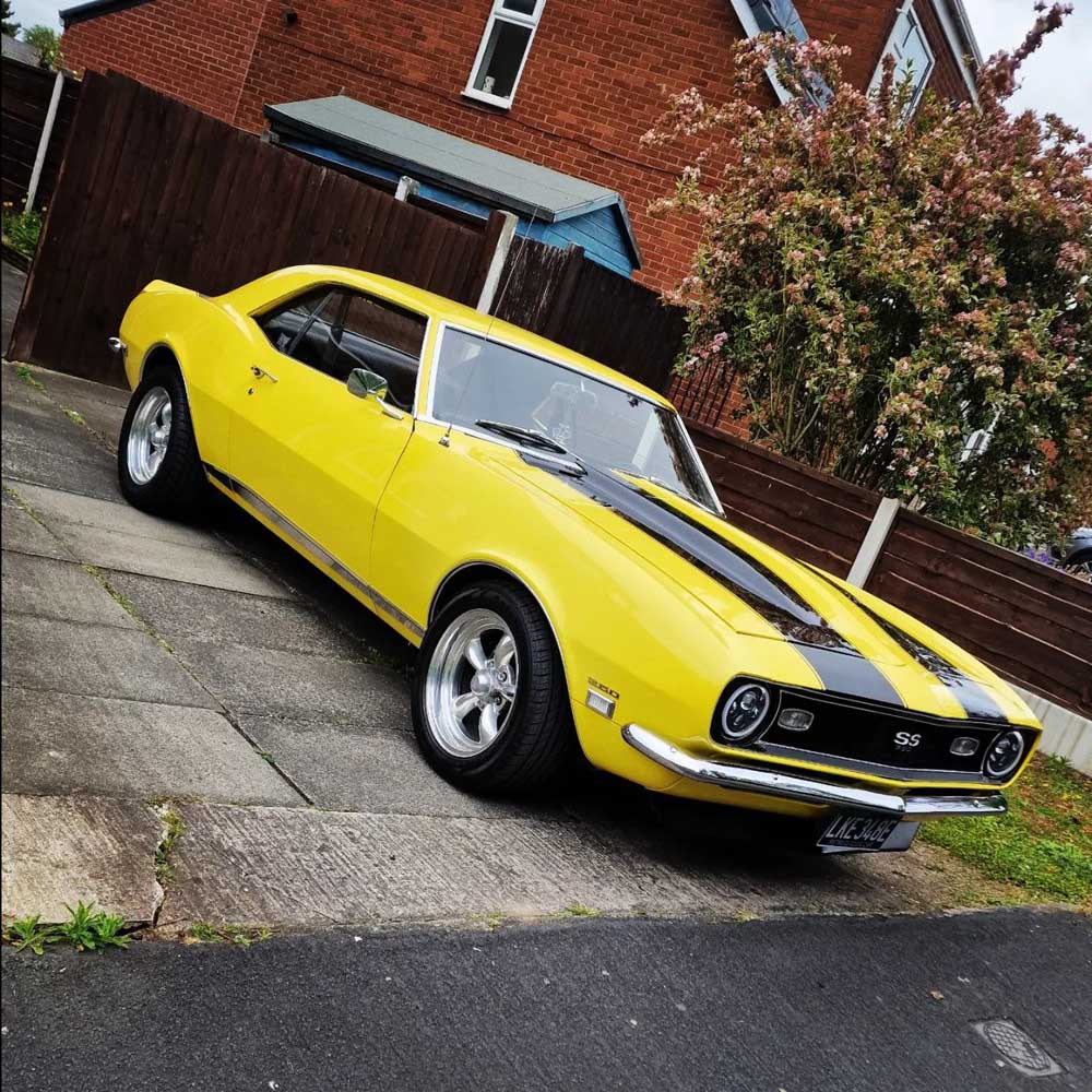 1968 Chevrolet Camaro 350 V8 5-speed manual. The car has an amazing background and tonnes of history. Finished in Bright Yellow with black bucket seats and interior. Full rotisserie restoration undertaken in the US at a cost of $75,000 built to exacting standards and put on show at SEMA. Fitted with a Chevy small block 350 mated to a Keisler Perfect Fit 5-speed transmission and driveshaft. Detroit Locker differential. 4-wheel disc brakes. All new interior and gauges. Hedman ceramic coated headers, S/S Magnaflow dual exhaust. New brakes/suspension/bushings. Detailed engine and engine bay with mirrored hood, detailed gloss black underside and 17in TorqThrust Polished alloys.